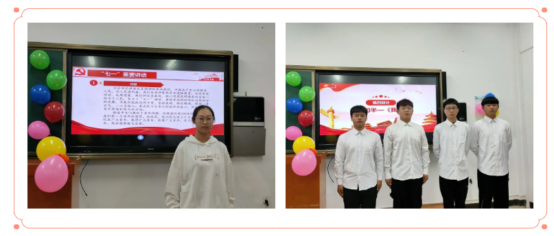 活动中21级大数据班级的李舟和谷萌同学带领同学们分别领读学习了“四史”精神和“七一”讲话的重要精神及相关内容,了解了我们党成立以来、新中国成立以来以及改革开放以来的重大事件、重要会议、重要文件以及重要人物;随后,由21级计算机二班的刘超、李佳豪、张学舟、徐洪兵同学带来的精彩三句半《我骄傲》,赞颂了我们党领导人民进行艰苦卓绝的斗争历程,燃起了同学们的爱国主义精神。