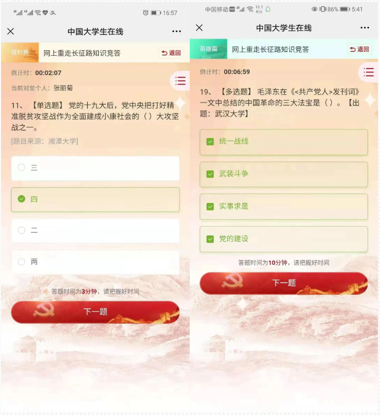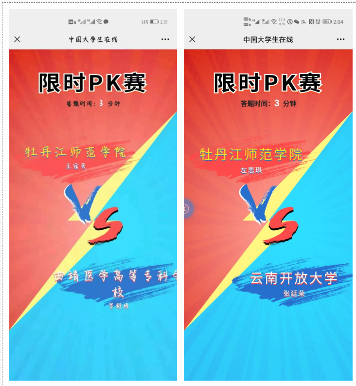 (2)PK模式:选手选择限时赛或抢十赛后,由系统随机匹配参与PK模式答题的对手,竞技争先。