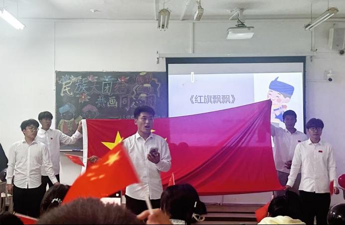 活动现场,由陈恺祺、胡臻等同学带来的朗诵《民族团结一家亲,同心共筑中国梦》,让同学们坚定维护民族团结的决心。随后,同学们一起观看视频《民族团结一家亲》,深刻感受到了中华大家庭的温暖与力量。最后,刘文强同学演唱歌曲《红旗飘飘》,歌声中充满对祖国的热爱与自豪。